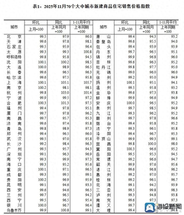 表1:2025年11月70个大中城市新建商品住宅销售价钱指数
