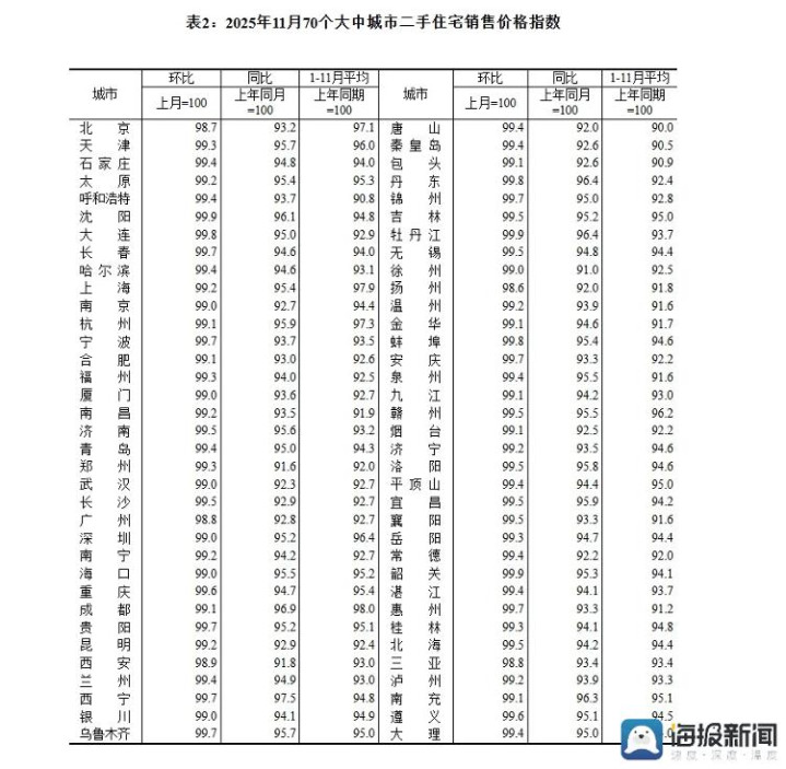 表2:2025年11月70个大中城市二手住宅销售价钱指数
