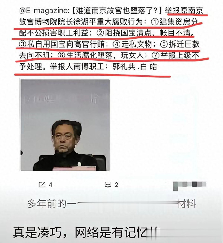 “互联网是有回顾的”——这句话,在南京博物院的陈年旧案被重新翻出时,显得尽头严容庄容。有东说念主翻出猛料:过去南博院长徐湖平,曾被院内职工实名举报倒卖藏品;更往前追忆,上世纪90年代的《浙江日报》,还曾刊登过南博防守员监守自盗被处决的重磅音讯。两桩旧案前后呼应,狠狠撕开了南博还是措置错落词语的口子,也让徐湖平的“梗直之身”打上了重重的问号。